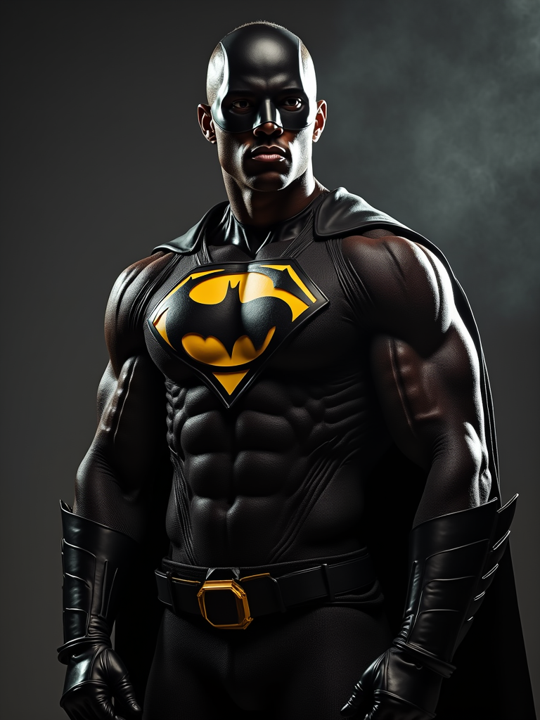 model as comic book hero, studio lights, wearing a bold superhero suit with a mask and gloves, action pose, dramatic shadows