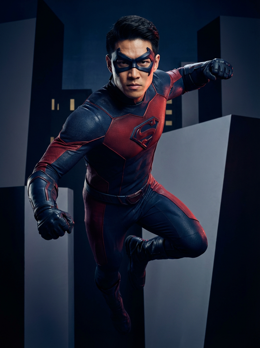 model as comic book hero, studio lights, wearing a bold superhero suit with a mask and gloves, action pose, dramatic shadows