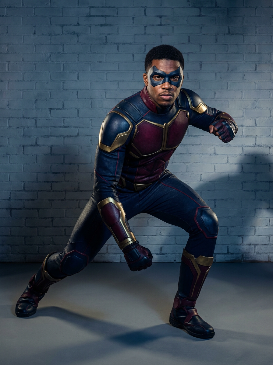 model as comic book hero, studio lights, wearing a bold superhero suit with a mask and gloves, action pose, dramatic shadows