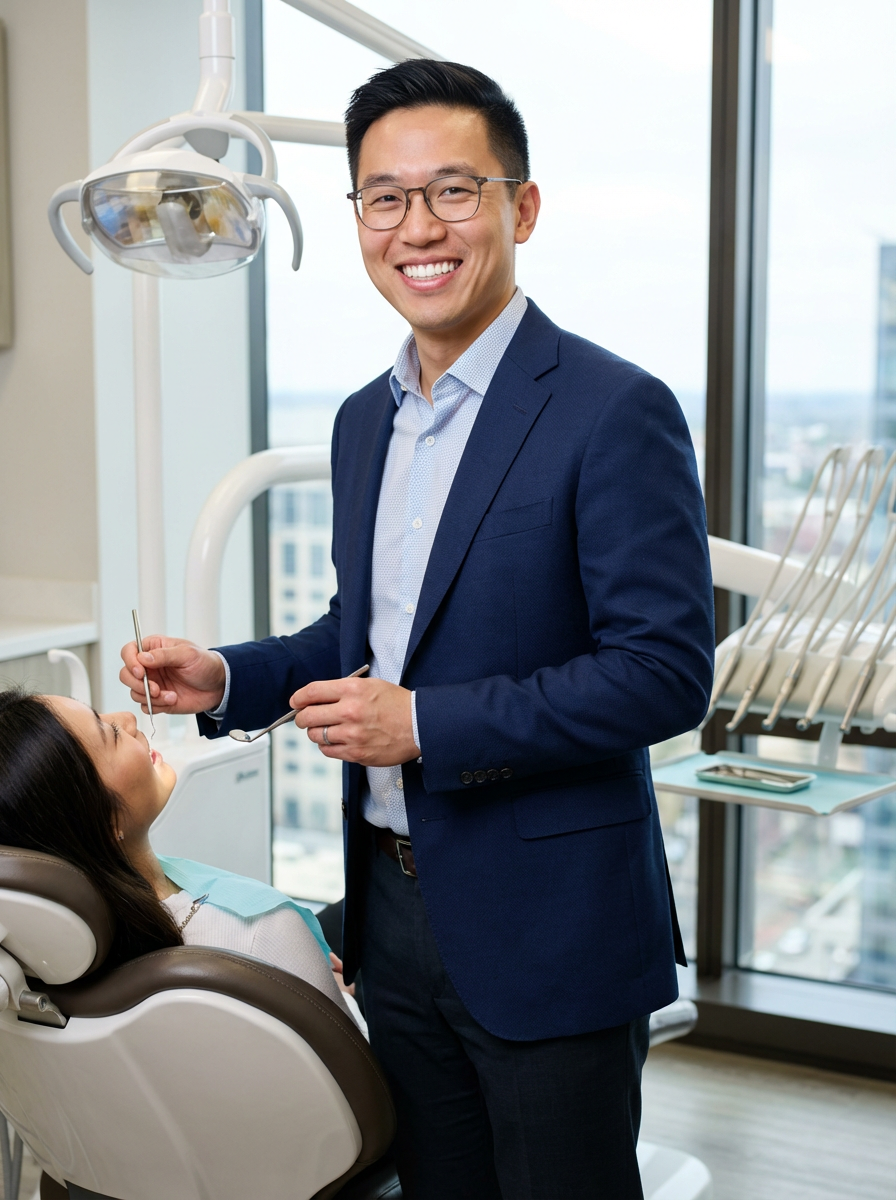 model as cosmetic dentist, stylish professional attire, bright perfect smile, upscale dental office