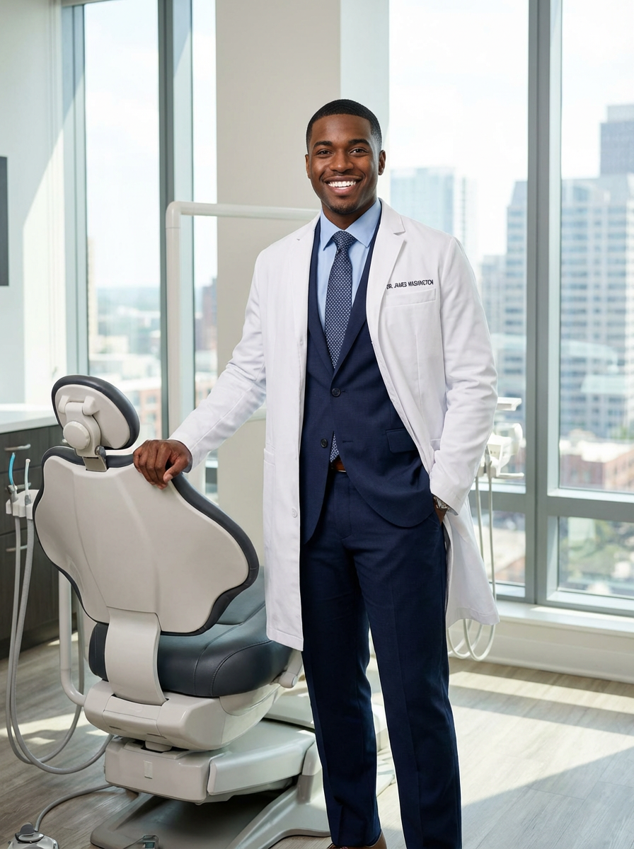 model as cosmetic dentist, stylish professional attire, bright perfect smile, upscale dental office
