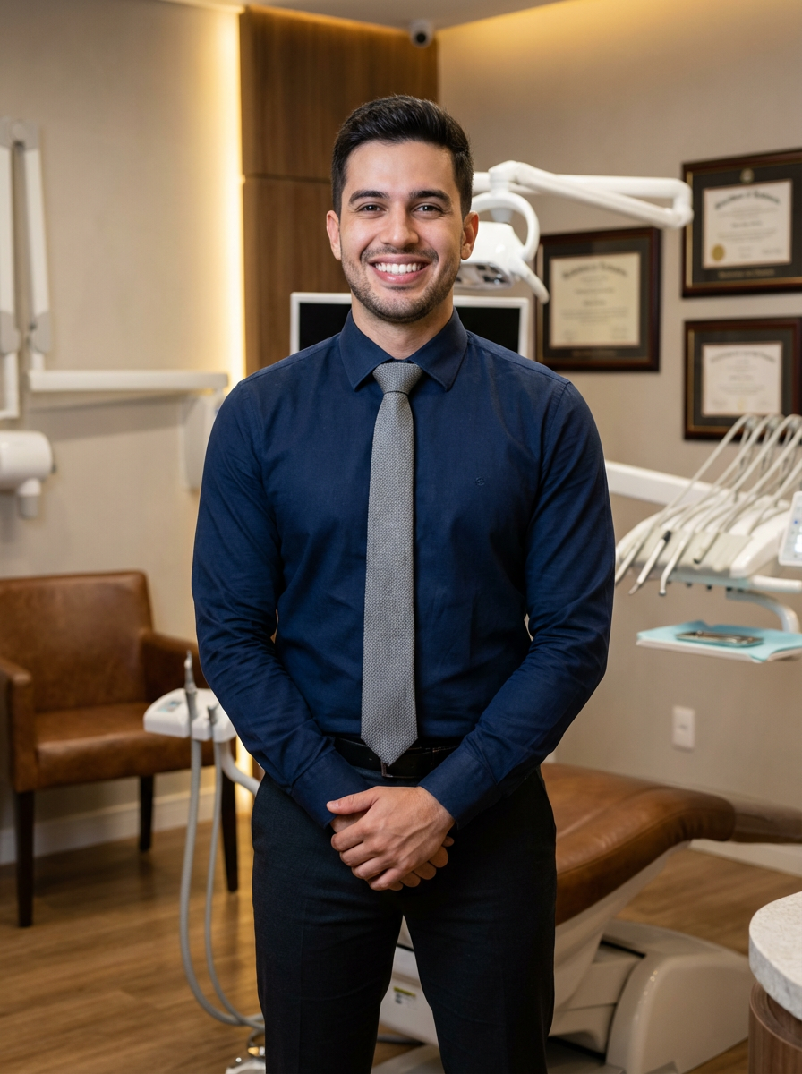 model as cosmetic dentist, stylish professional attire, bright perfect smile, upscale dental office