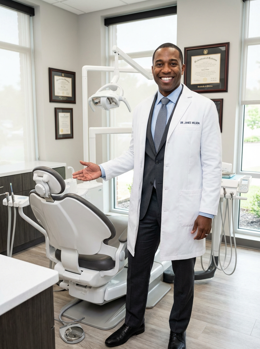 model as cosmetic dentist, stylish professional attire, bright perfect smile, upscale dental office