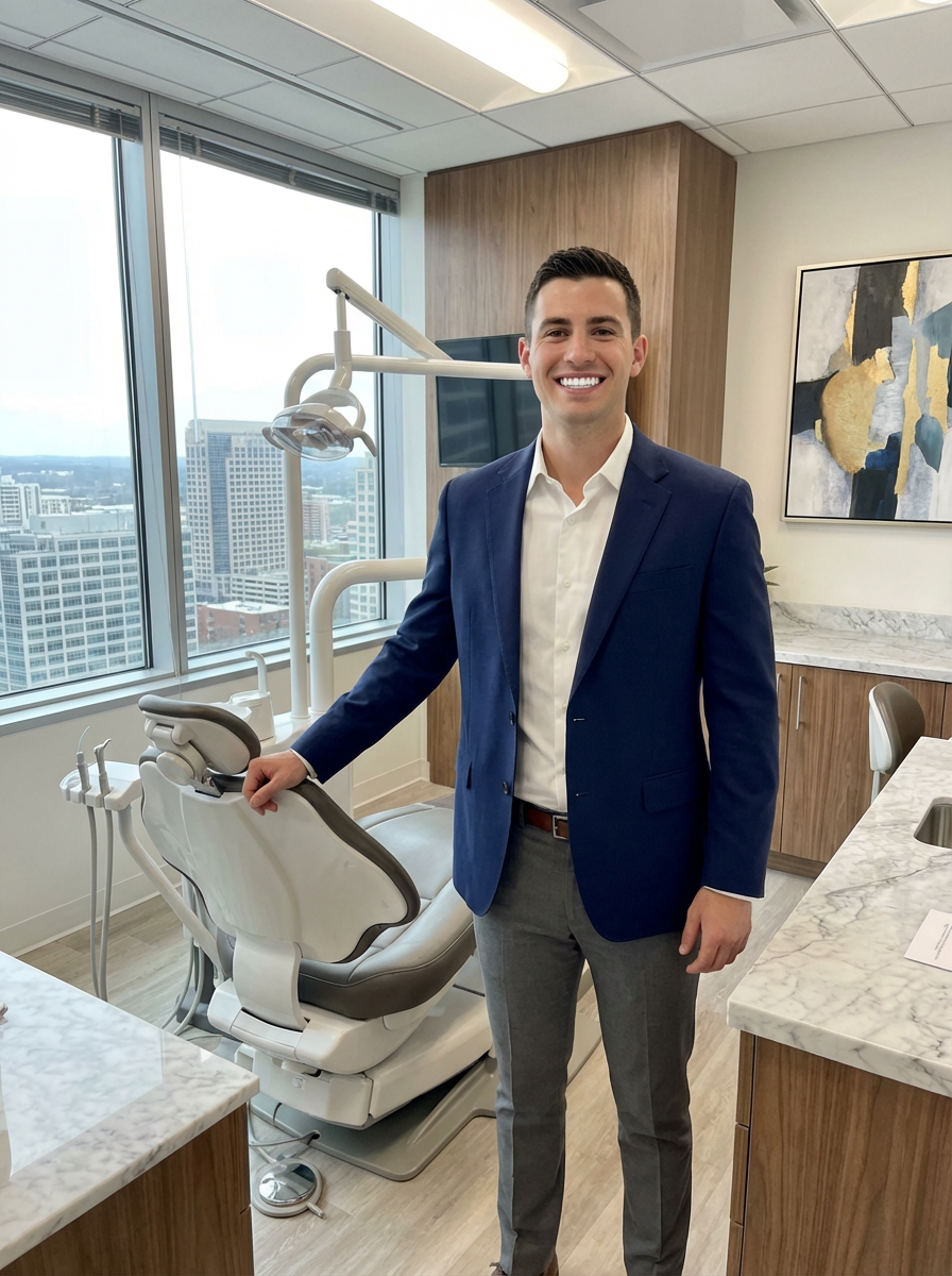 model as cosmetic dentist, stylish professional attire, bright perfect smile, upscale dental office