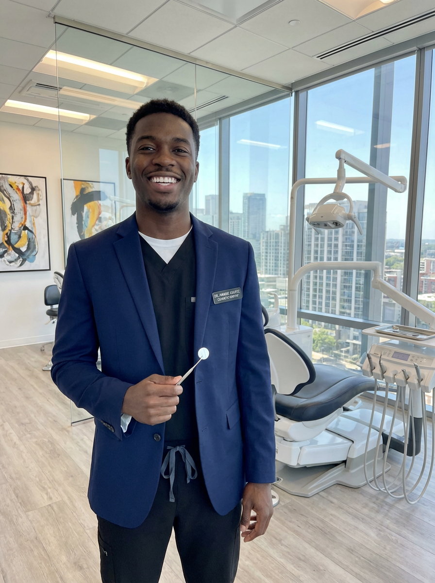 model as cosmetic dentist, stylish professional attire, bright perfect smile, upscale dental office