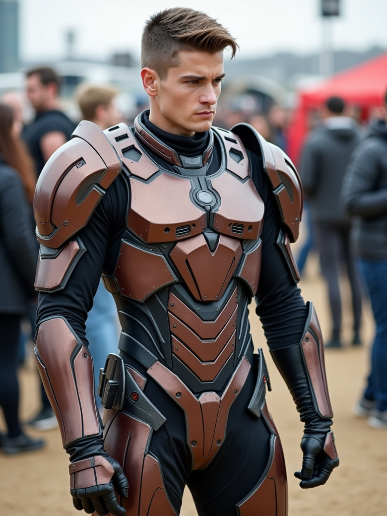 model as cosplayer at an outdoor convention, wearing a futuristic armored suit, vibrant cosplay atmosphere, surrounded by fans and cosplayers, dynamic poses