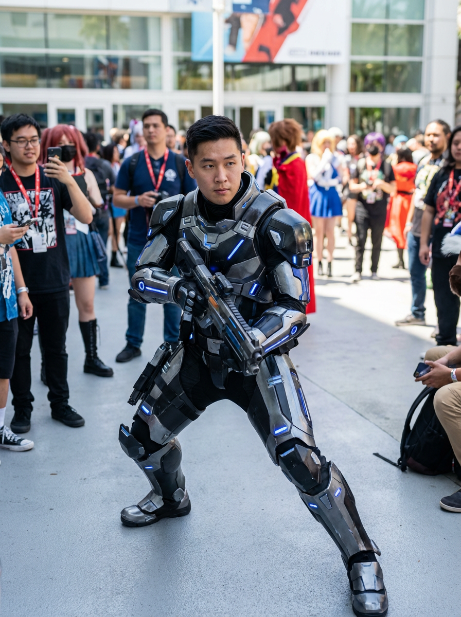 model as cosplayer at an outdoor convention, wearing a futuristic armored suit, vibrant cosplay atmosphere, surrounded by fans and cosplayers, dynamic poses
