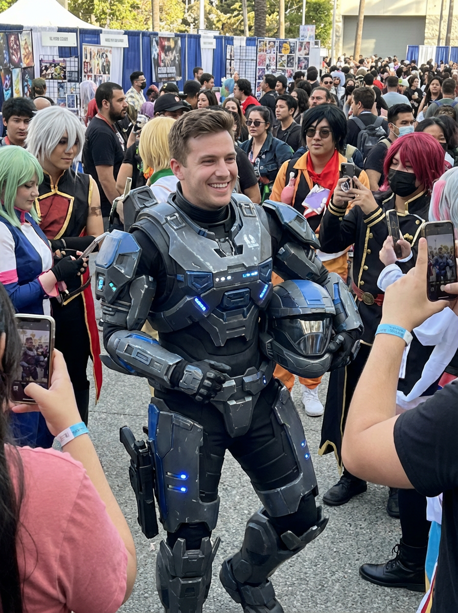 model as cosplayer at an outdoor convention, wearing a futuristic armored suit, vibrant cosplay atmosphere, surrounded by fans and cosplayers, dynamic poses