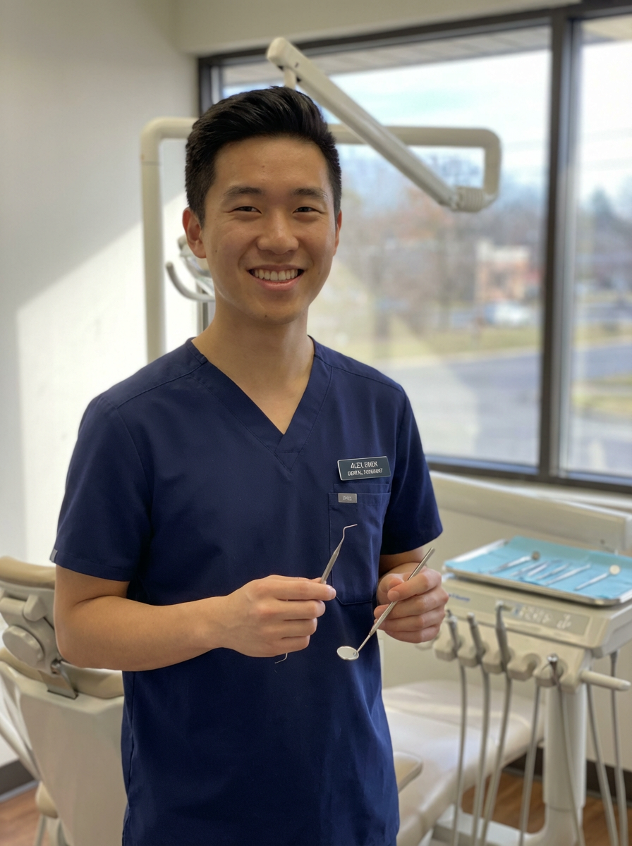 model as dental hygienist, clean scrubs, warm welcoming smile, dental operatory background
