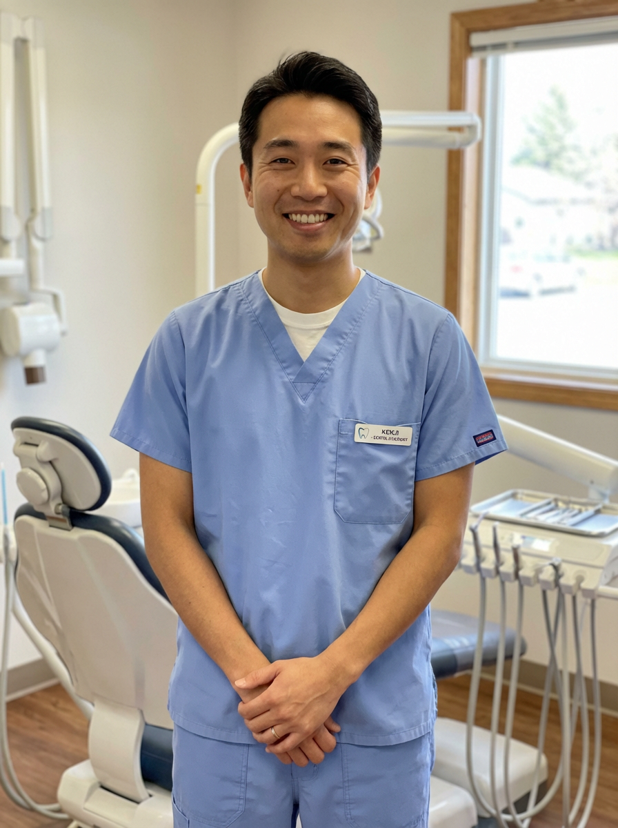 model as dental hygienist, clean scrubs, warm welcoming smile, dental operatory background