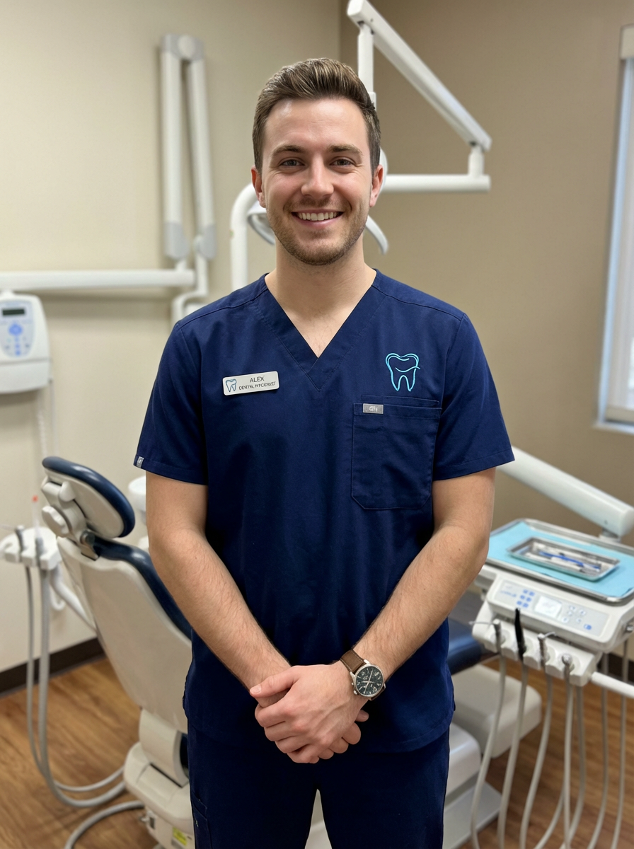 model as dental hygienist, clean scrubs, warm welcoming smile, dental operatory background
