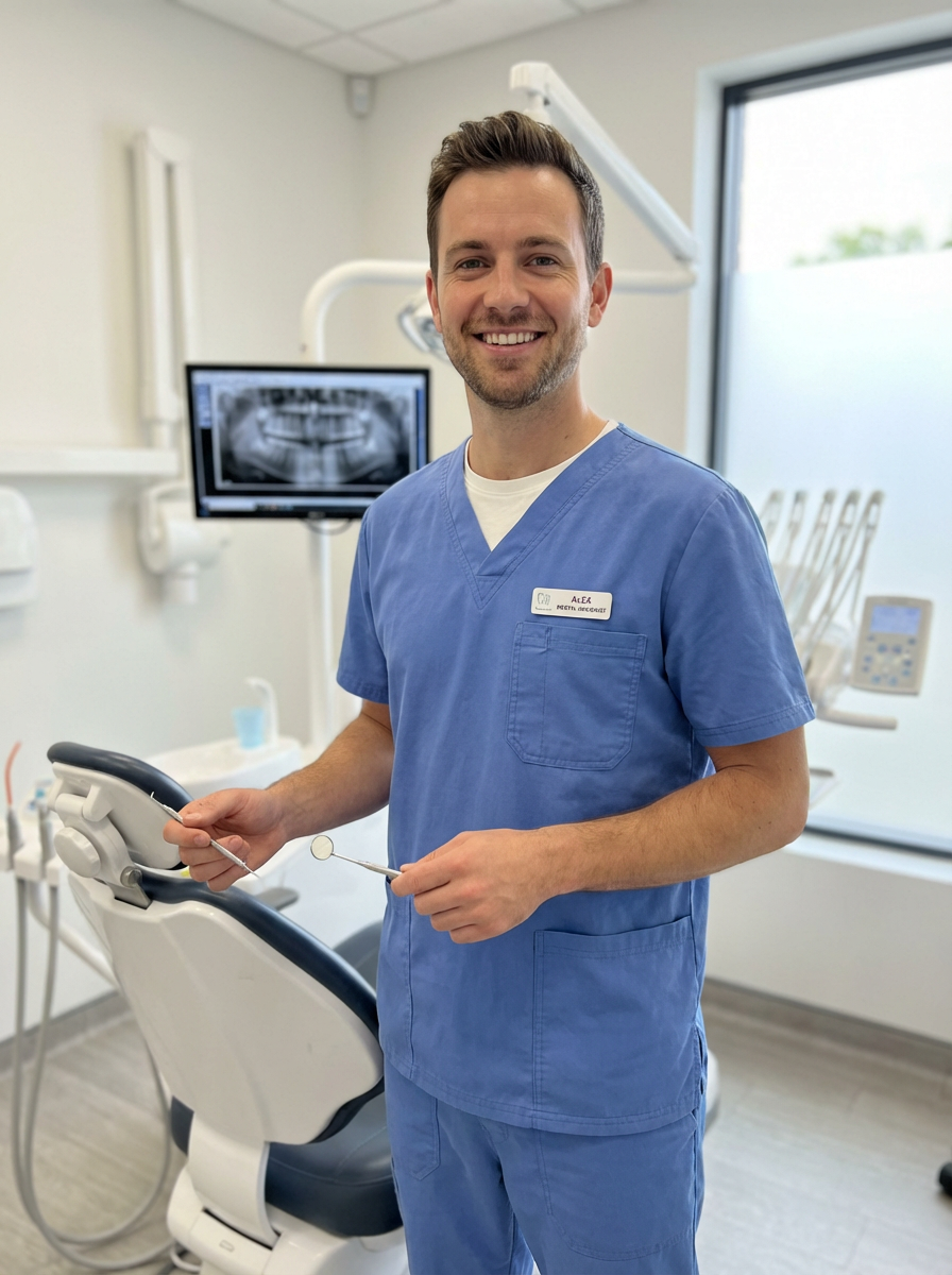 model as dental hygienist, clean scrubs, warm welcoming smile, dental operatory background