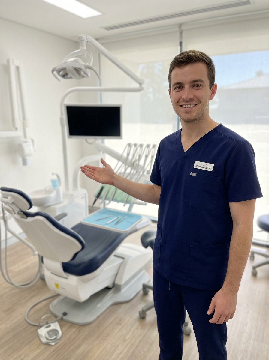 model as dental hygienist, clean scrubs, warm welcoming smile, dental operatory background