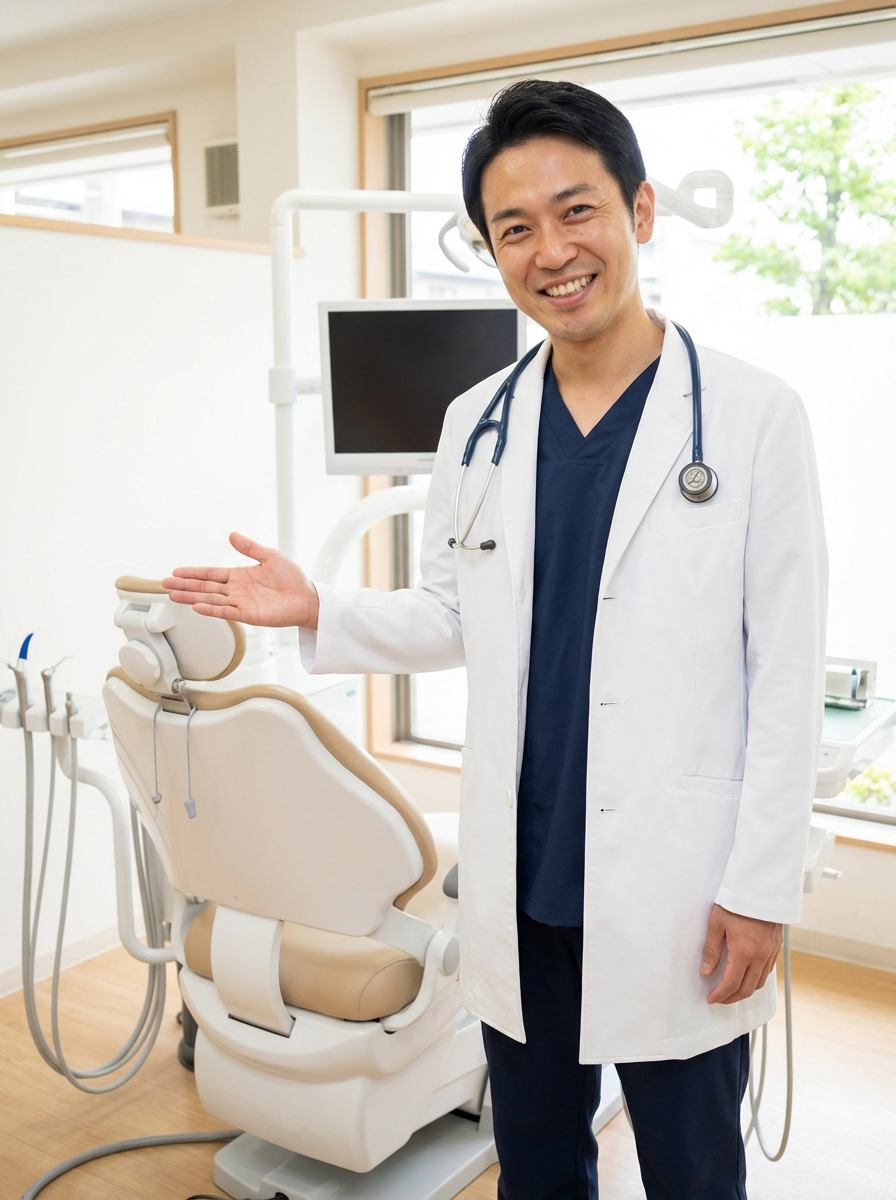 model as dental professional, wearing scrubs and lab coat, friendly reassuring expression, dental clinic setting