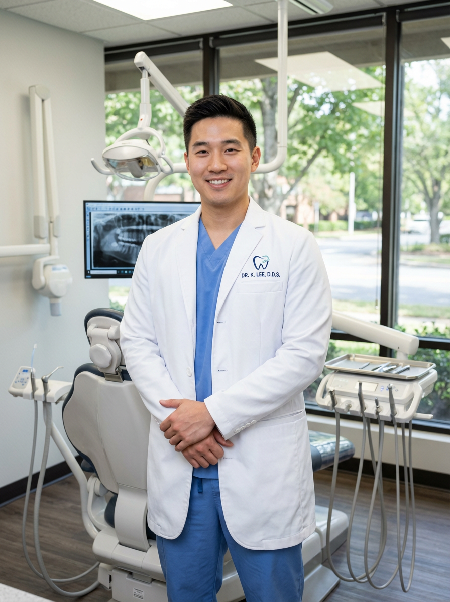 model as dental professional, wearing scrubs and lab coat, friendly reassuring expression, dental clinic setting