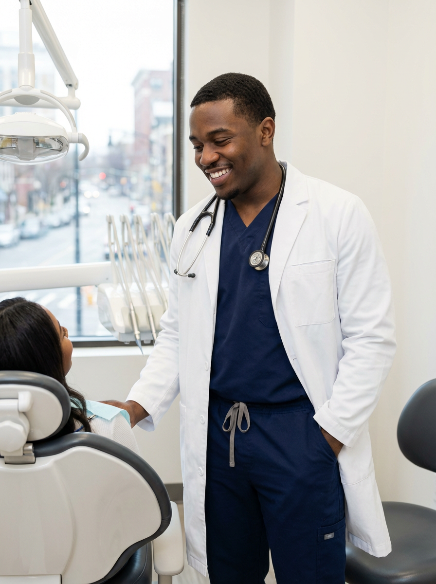 model as dental professional, wearing scrubs and lab coat, friendly reassuring expression, dental clinic setting