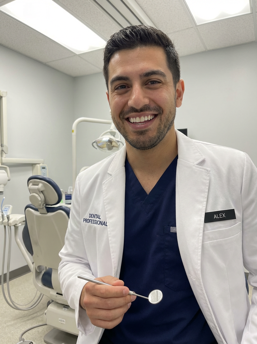 model as dental professional, wearing scrubs and lab coat, friendly reassuring expression, dental clinic setting