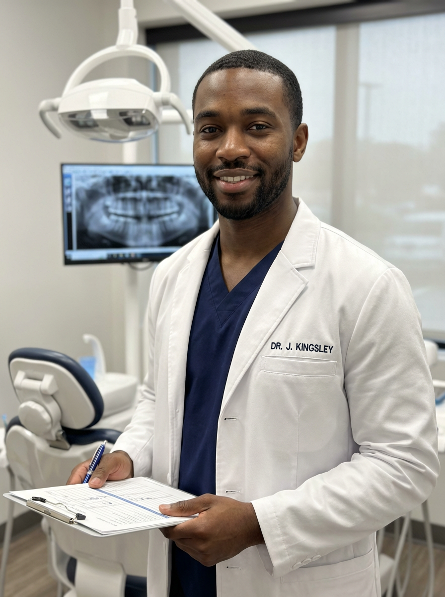 model as dental professional, wearing scrubs and lab coat, friendly reassuring expression, dental clinic setting