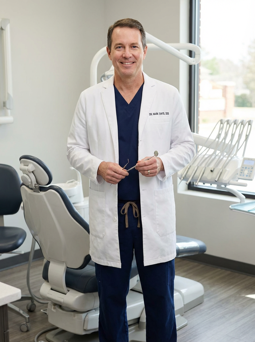 model as dental professional, wearing scrubs and lab coat, friendly reassuring expression, dental clinic setting