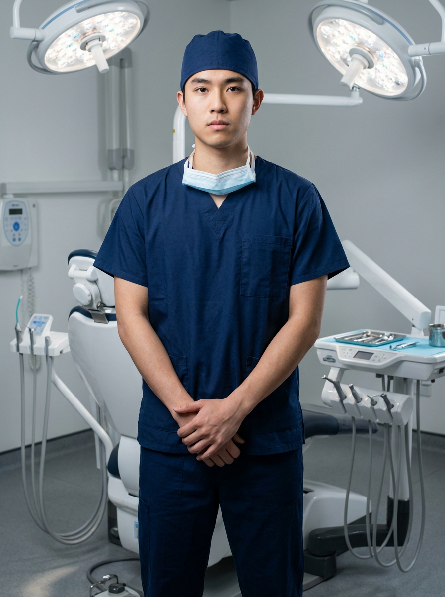 model as dental surgeon, surgical scrubs and cap, competent serious expression, sterile environment