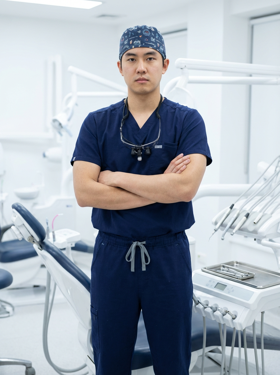 model as dental surgeon, surgical scrubs and cap, competent serious expression, sterile environment