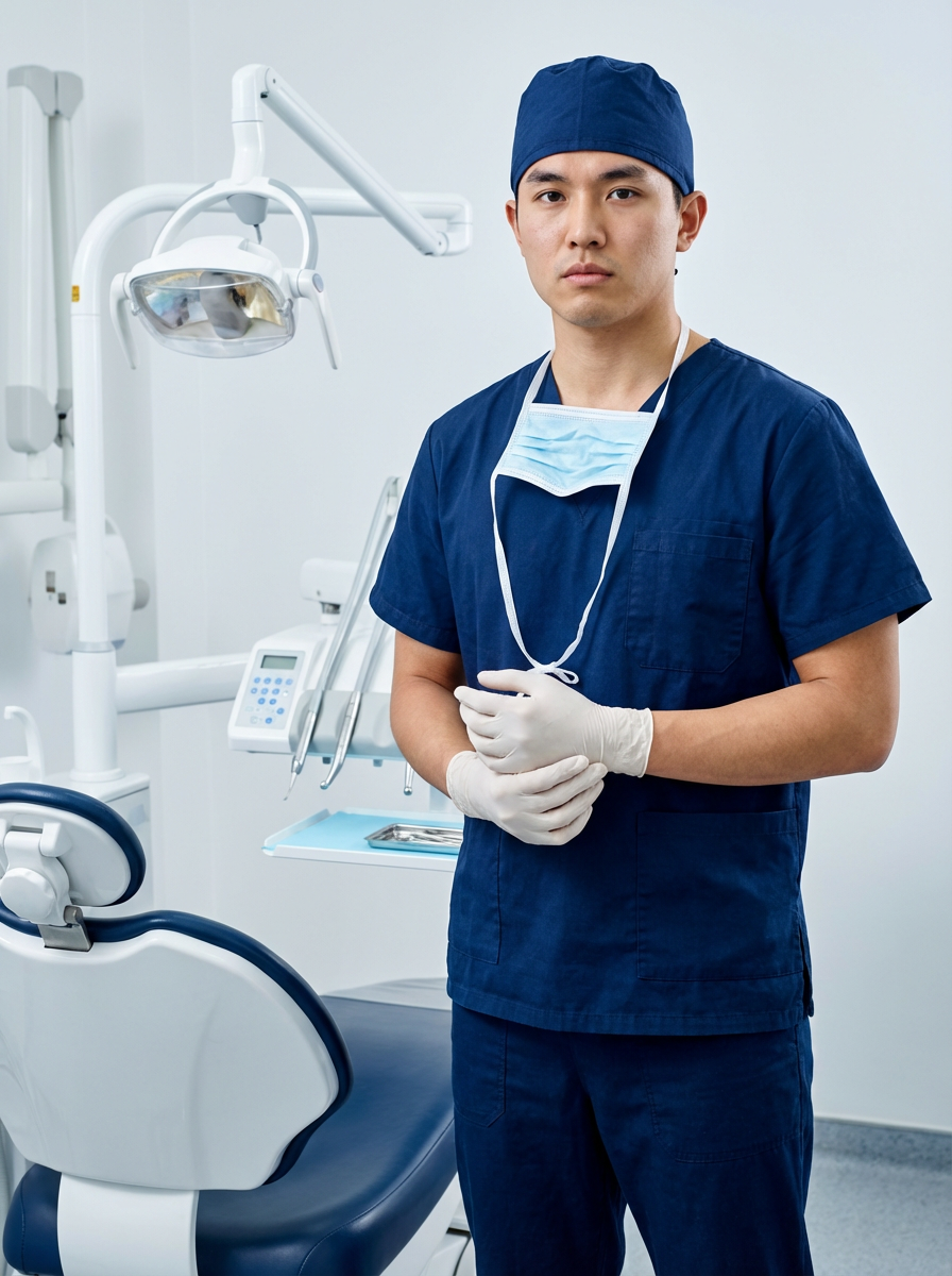model as dental surgeon, surgical scrubs and cap, competent serious expression, sterile environment