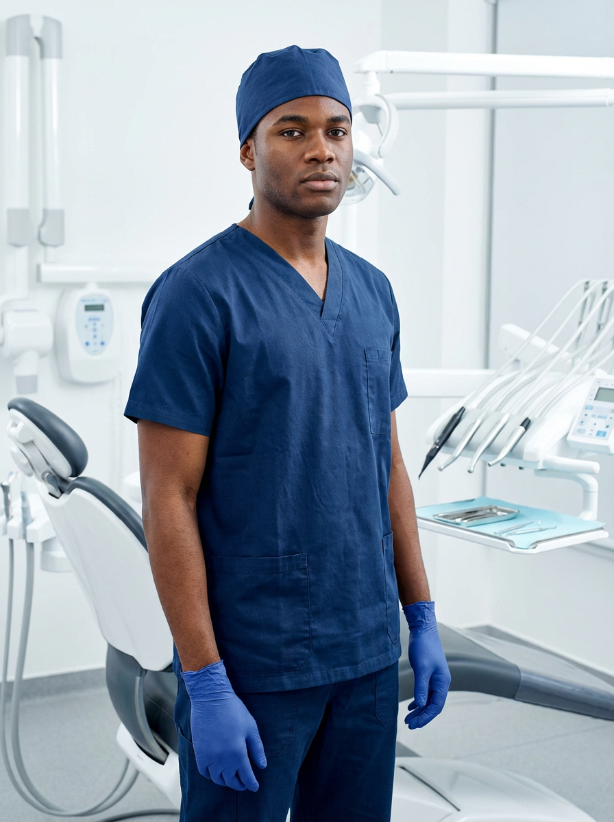 model as dental surgeon, surgical scrubs and cap, competent serious expression, sterile environment
