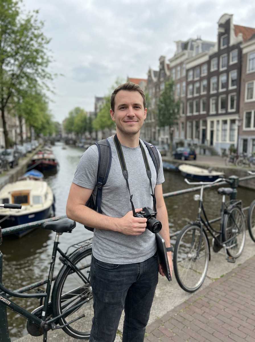 model as digital nomad in Amsterdam with the Amsterdam Canals in background, with backpack