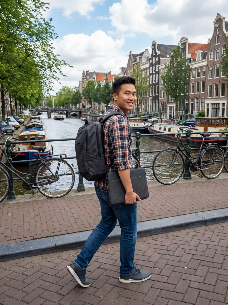model as digital nomad in Amsterdam with the Amsterdam Canals in background, with backpack