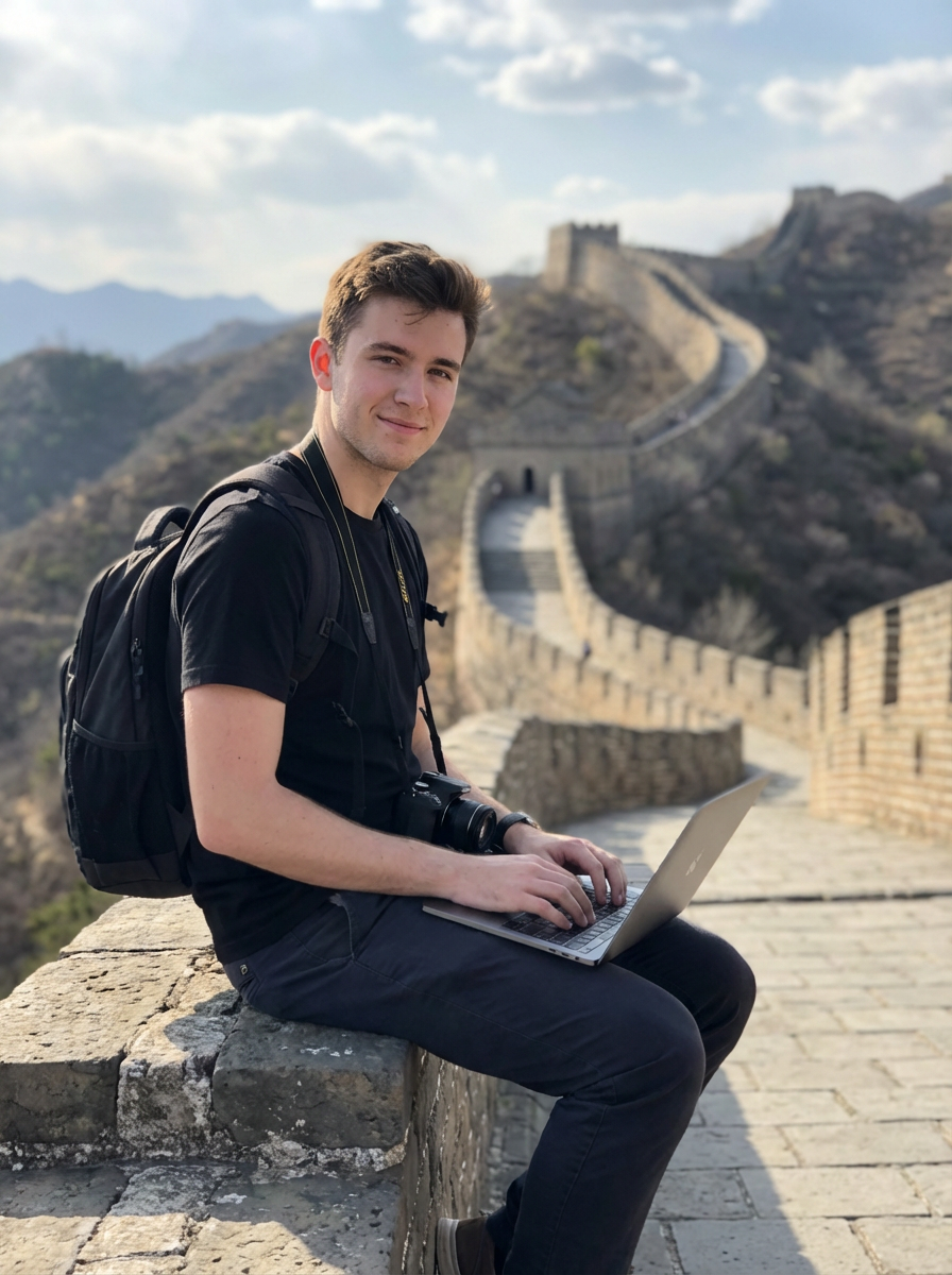 model as digital nomad in Beijing with the Great Wall in the background, with backpack