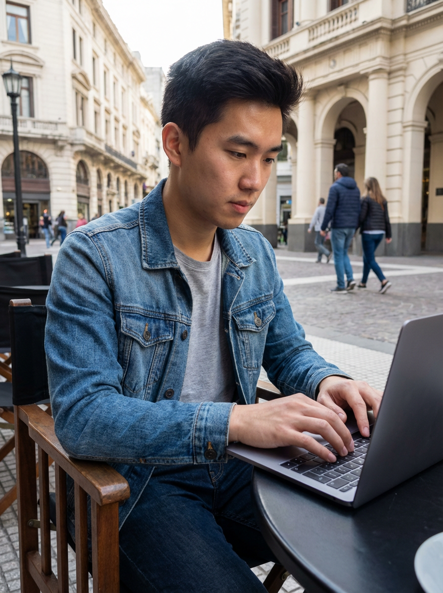 model as digital nomad in Buenos Aires in Argentina, working on laptop