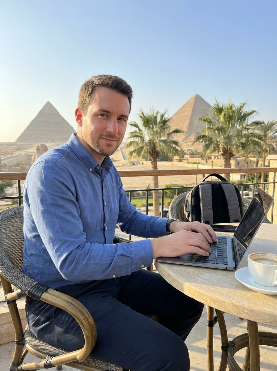 model as digital nomad in Cairo with the Pyramids of Giza in the background, working on laptop