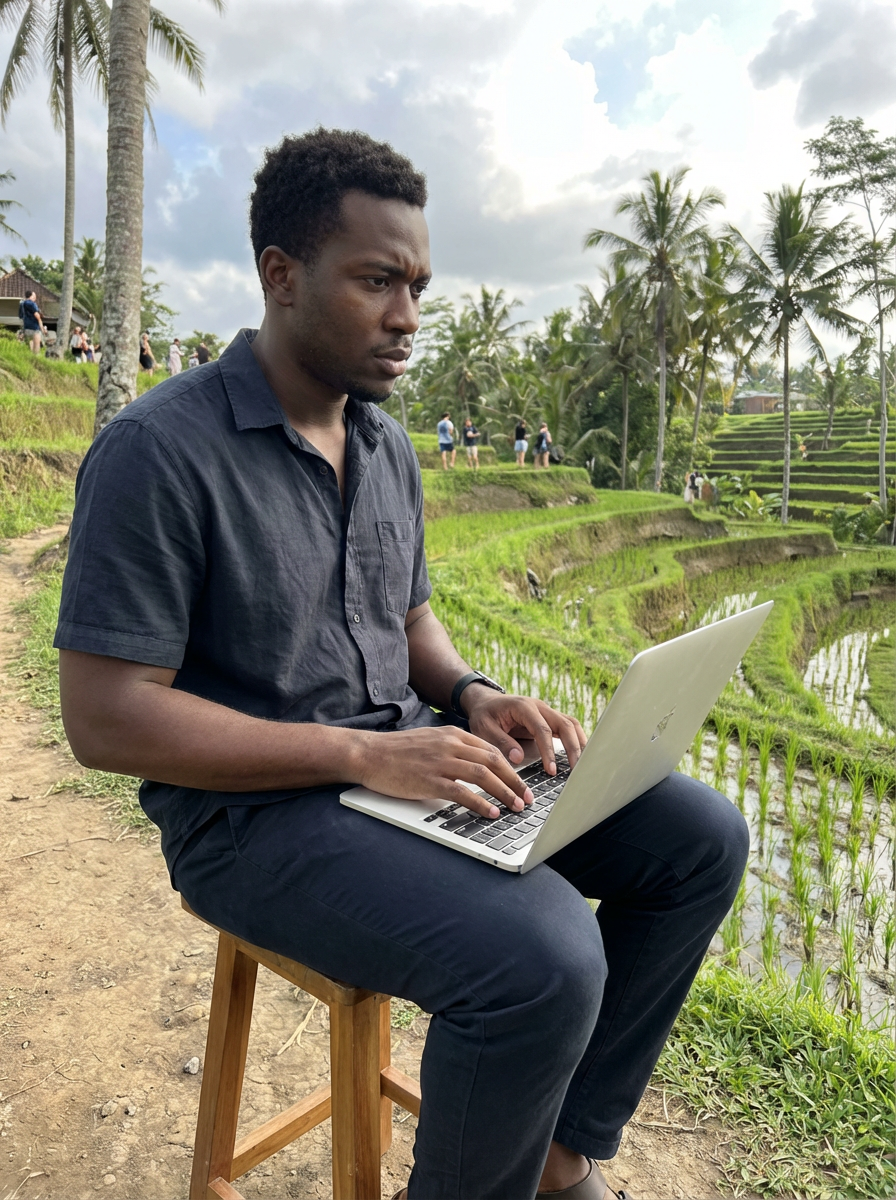 model as digital nomad in Canggu, Bali near rice fields, working on laptop