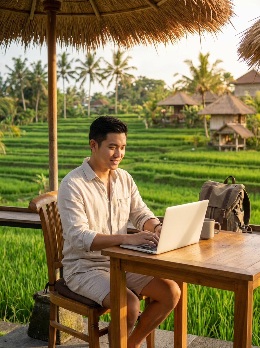 model as digital nomad in Canggu, Bali near rice fields, working on laptop