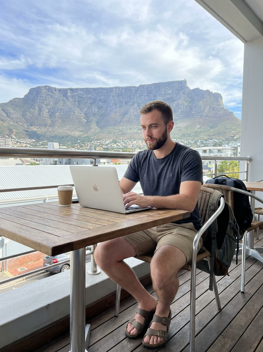 model as digital nomad in Cape Town with the Table Mountain in the background, working on laptop