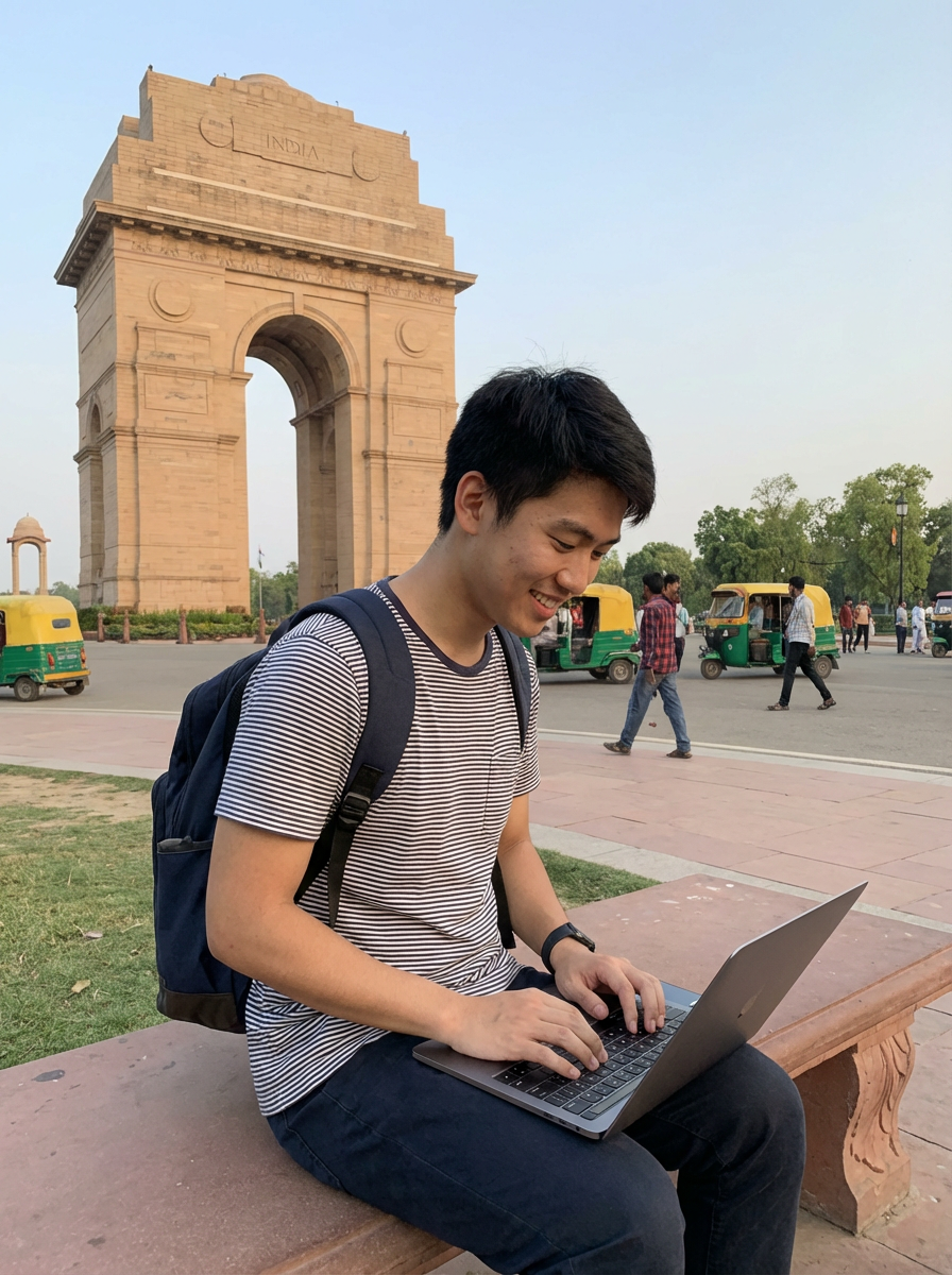 model as digital nomad in Delhi with the India Gate in the background, with backpack