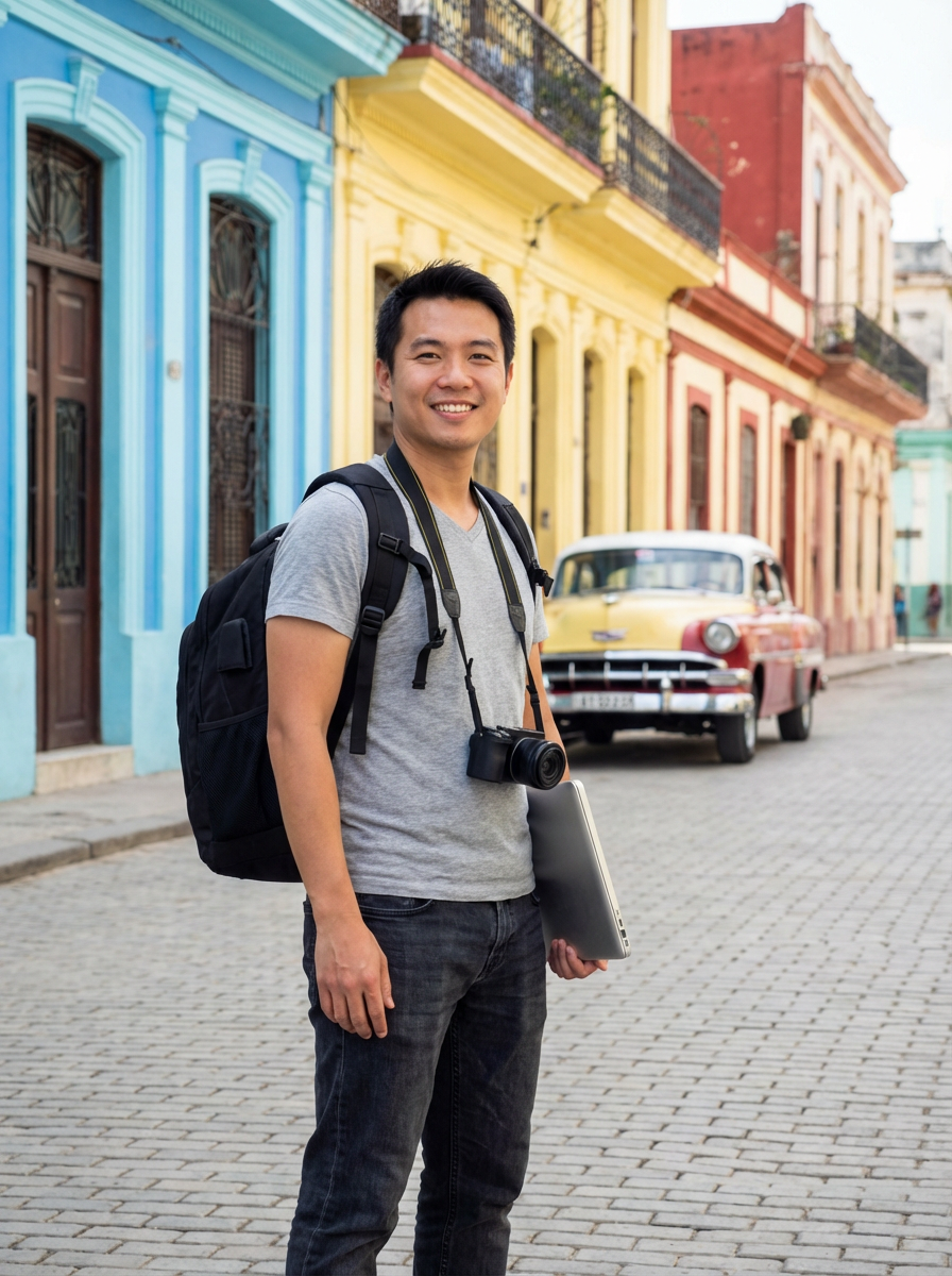model as digital nomad in Havana with the colorful old town in the background, with backpack