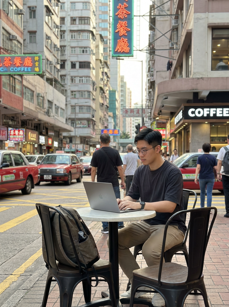 model as digital nomad in Hong Kong, working on laptop