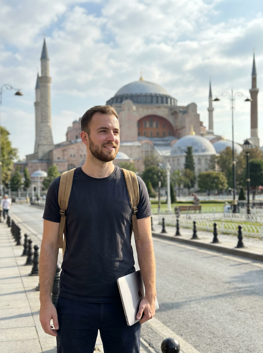 model as digital nomad in Istanbul with The Mosque in background, with backpack