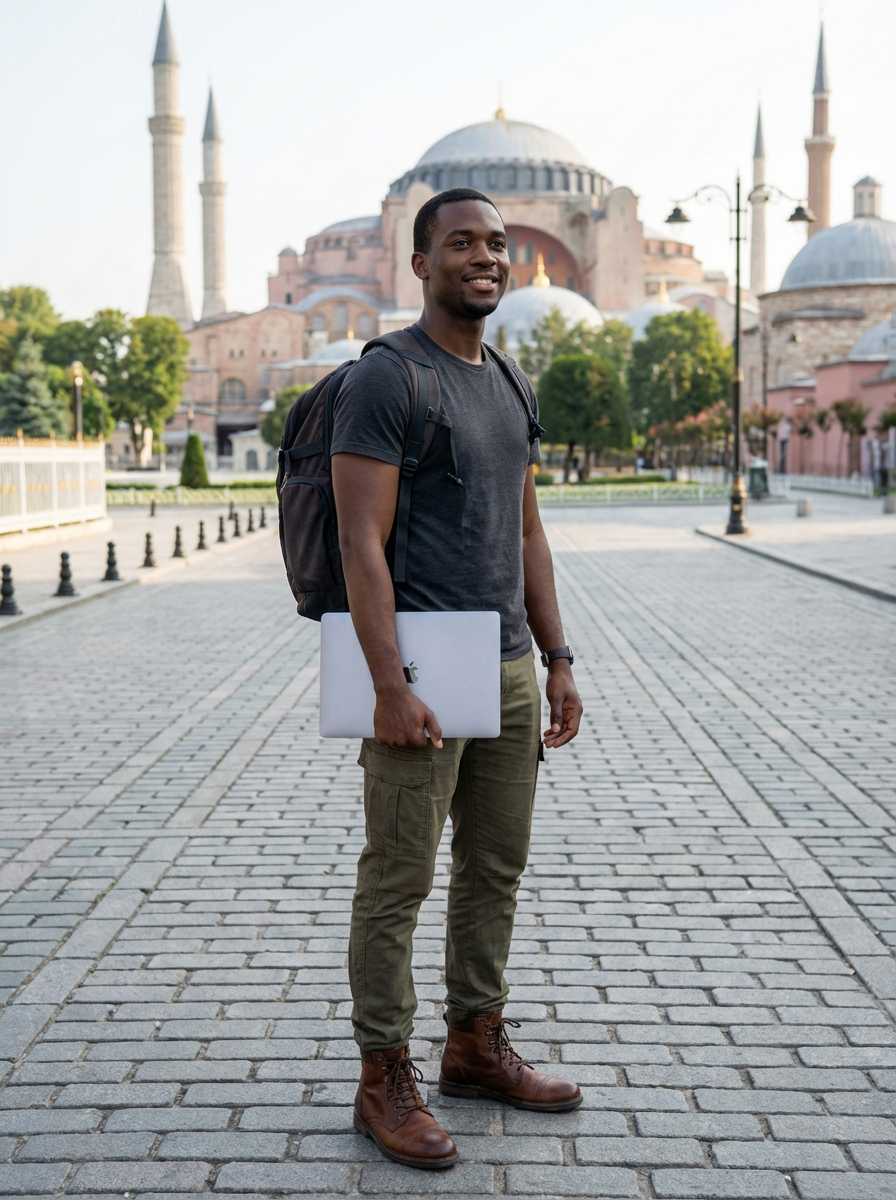 model as digital nomad in Istanbul with The Mosque in background, with backpack