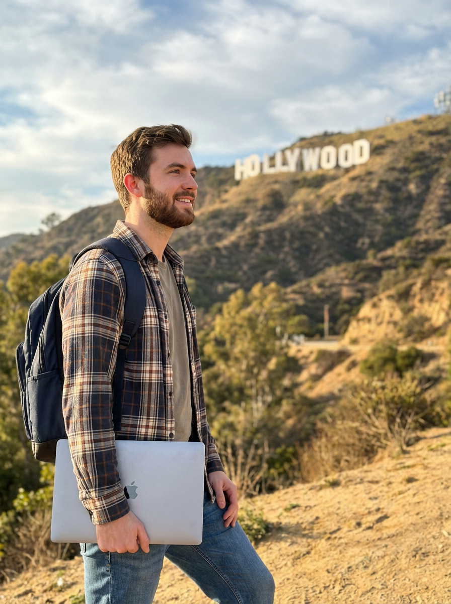 model as digital nomad in Los Angeles with the Hollywood sign in the background, with backpack