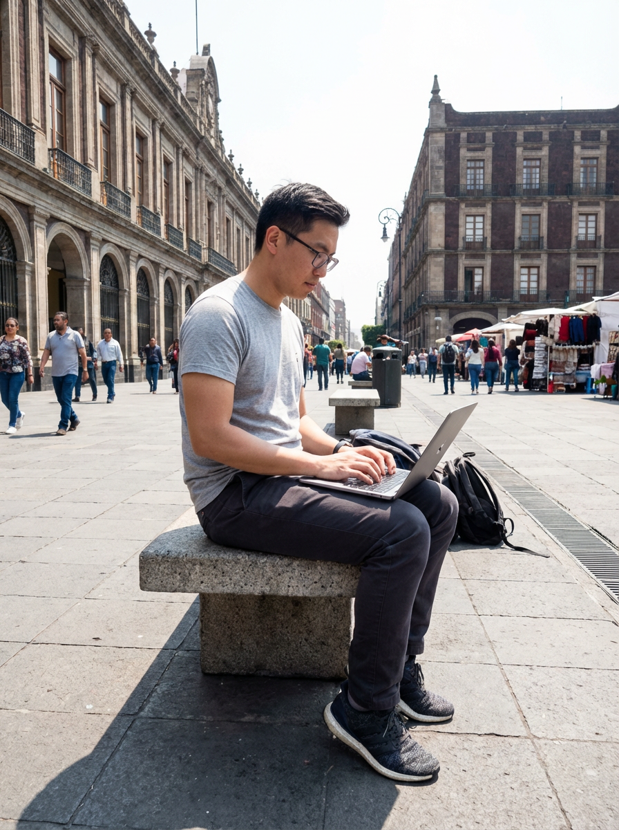 model as digital nomad in Mexico City center, working on laptop
