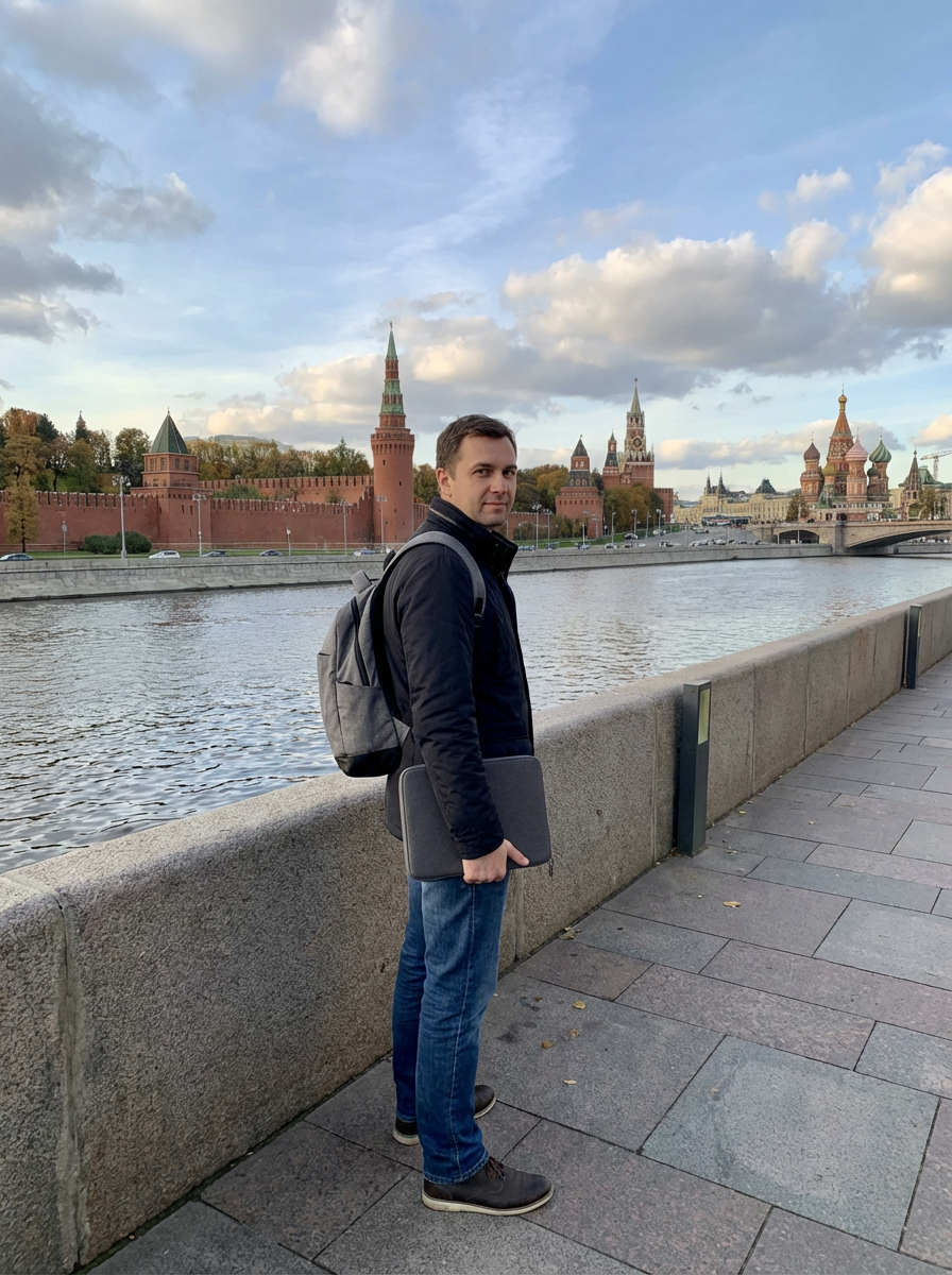 model as digital nomad in Moscow with the Kremlin in the background, with backpack