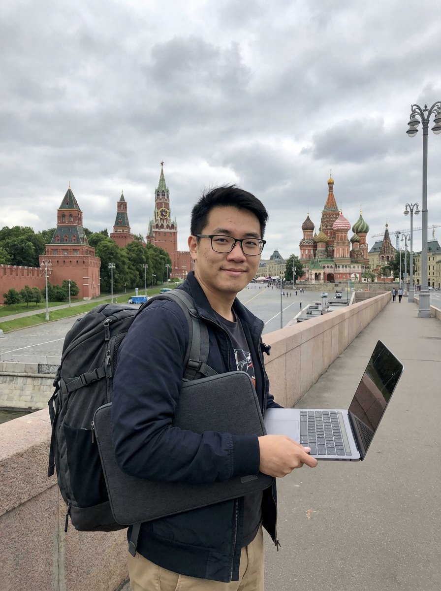 model as digital nomad in Moscow with the Kremlin in the background, with backpack