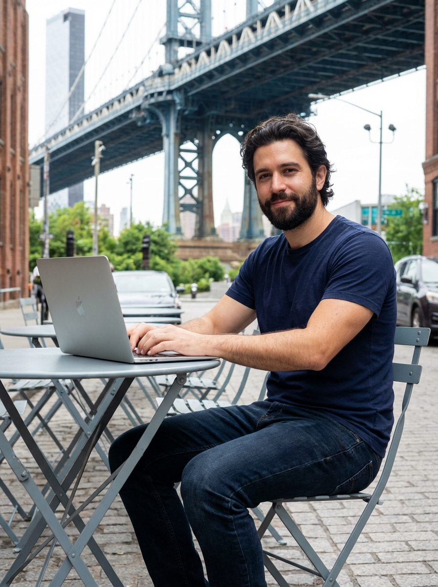 model as digital nomad in New York City with Manhattan in background, working on laptop