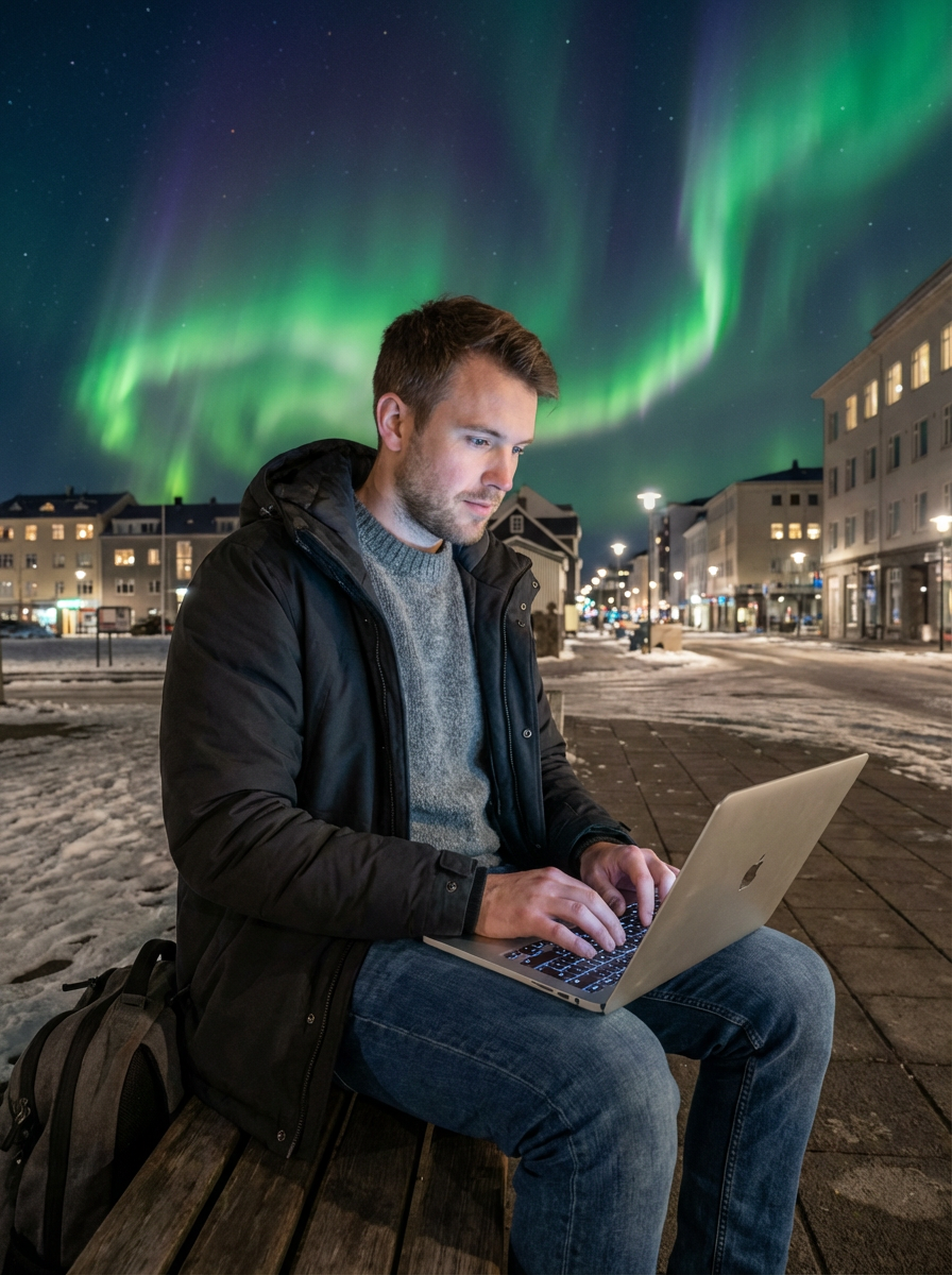model as digital nomad in Reykjavik with the Northern Lights in the background, working on laptop