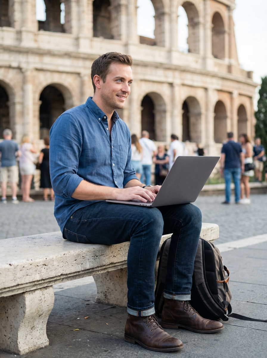 model as digital nomad in Rome with the Colosseum in the background, working on laptop