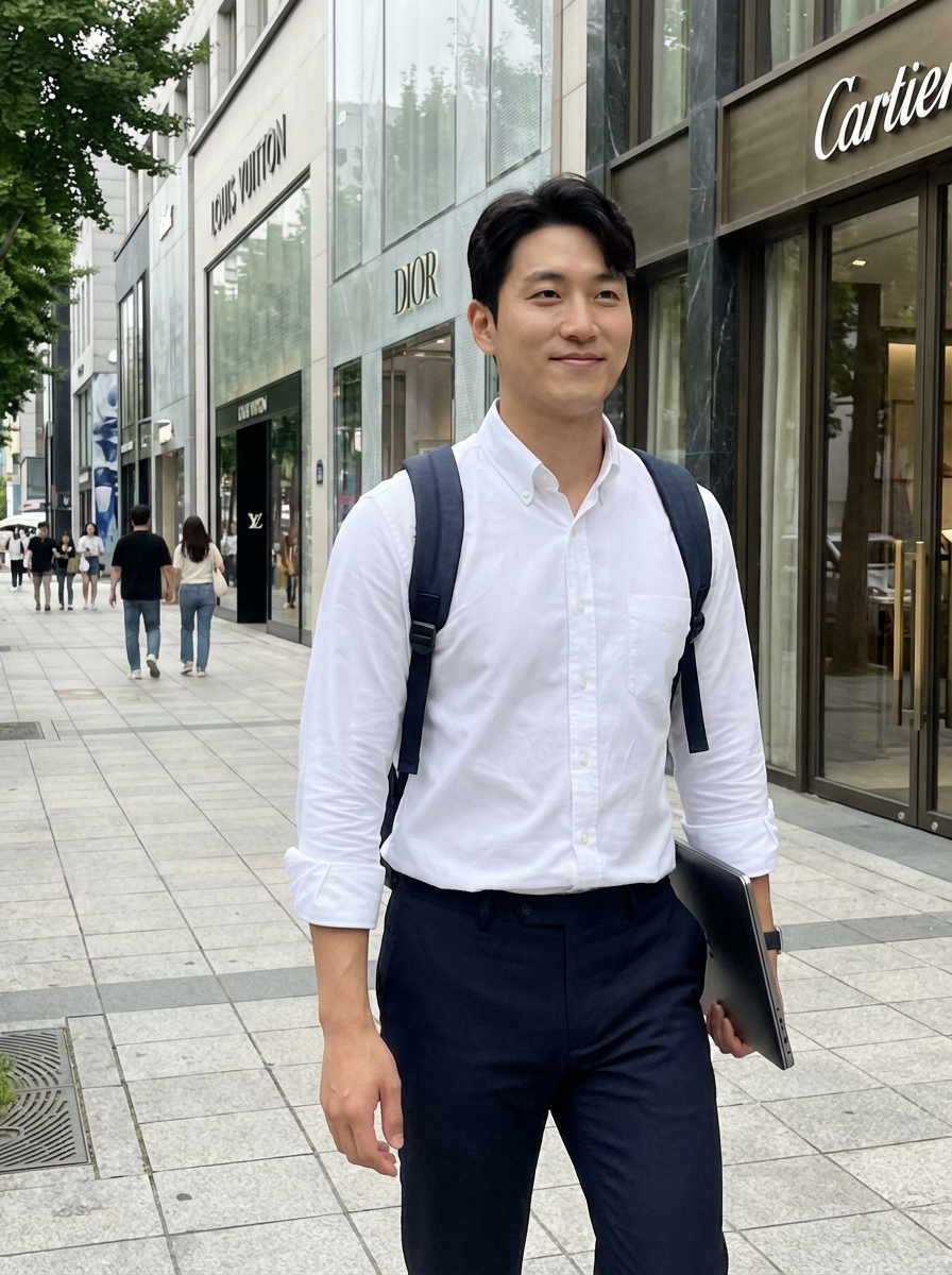 model as digital nomad in Seoul in Gangnam in Cheongdamdong Luxury Shopping street. stores visible in background, with backpack
