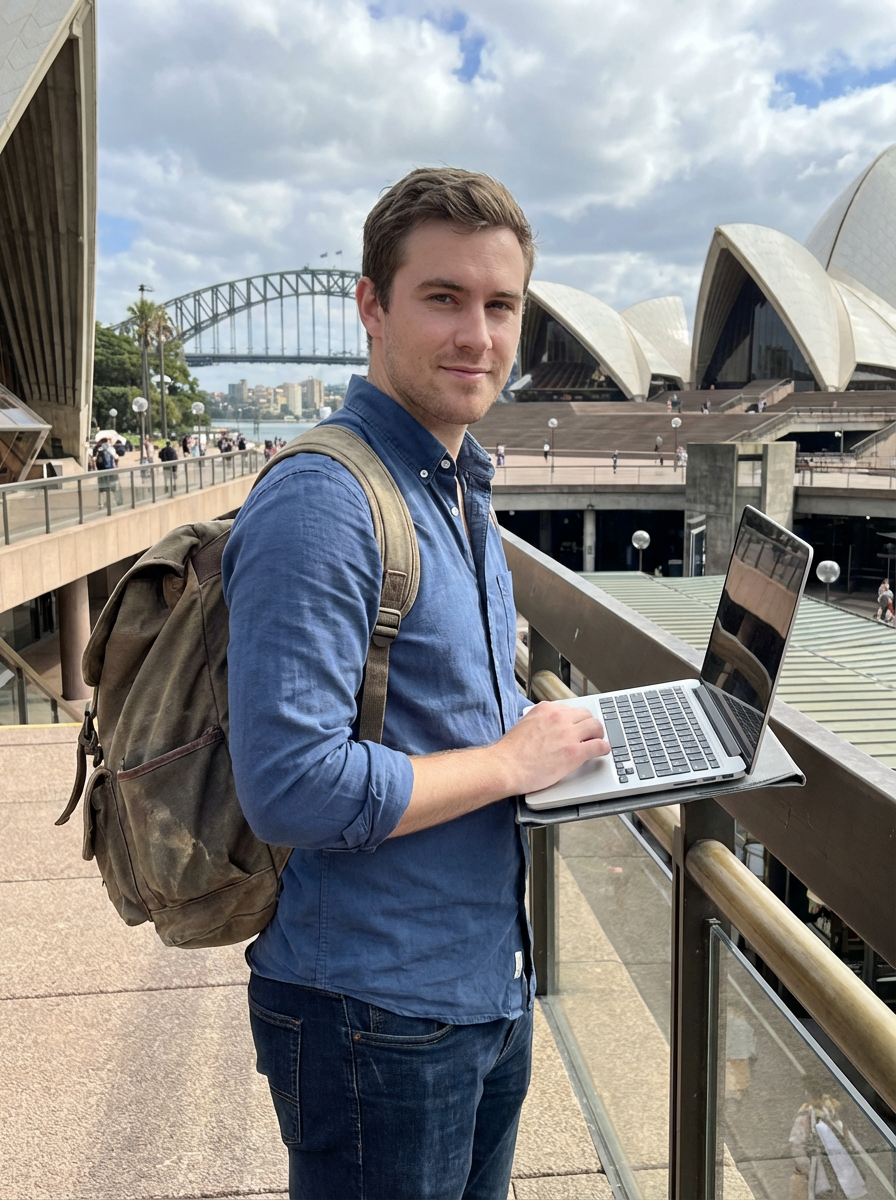 model as digital nomad in Sydney with the Sydney Opera House in the background, with backpack