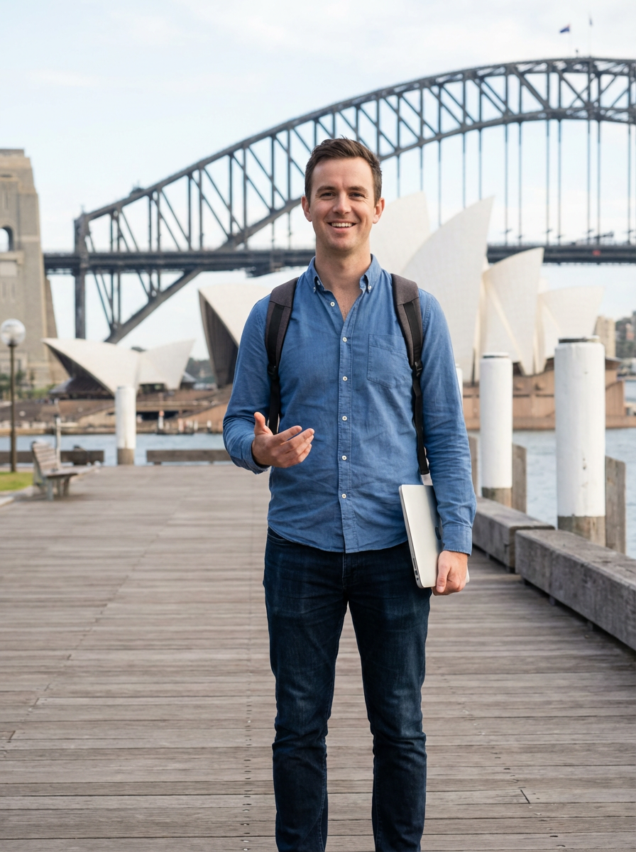 model as digital nomad in Sydney with the Sydney Opera House in the background, with backpack